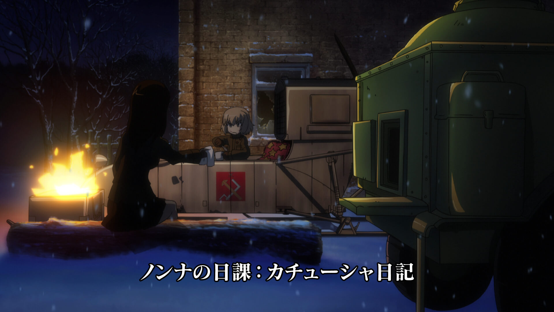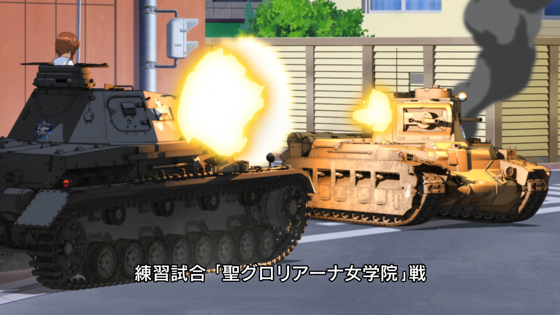 イントロ TVシリーズ OVA 劇場版 第1話 第2話 第3話 第4話 第5話 第5.5話 第6話 第7話 第8話 第9話 第10話 第10.5話 第11話 第12話 第10.5話「紹介します 2!」 弱小チームながらも、メンバーの知恵と勇気と友情で辛くも戦車道全国高校生大会を勝ち進んできた大洗女子学園。いよいよ黒森峰女学園との決勝戦がスタートした今、改めてみほと優花里がこれまでの道のりを対戦相手のメンバーや使用車輌、戦術の解説を交えながら振り返る。